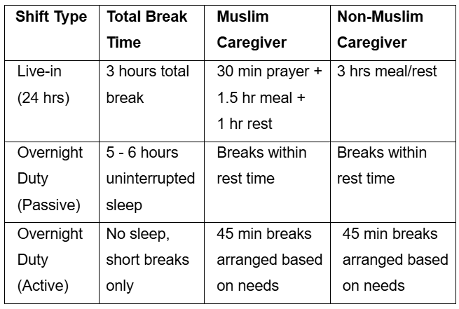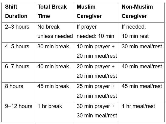 - Breaks are intended for meals, personal rest, and prayers (for Muslim caregivers).