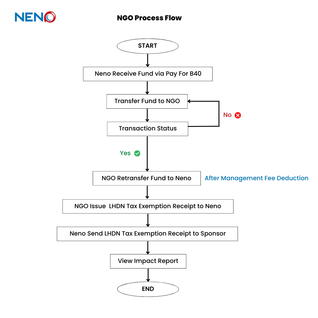 Figure 3 demonstrates the NGO Process Flow as a guidance for NGO. Funds received via Pay-for-Impact tab in NENO Commerce Site will be transferred to the NGO in the same amount. Once the transaction status is confirmed as approved, the NGO will transfer the funds back after deduction of management fee as well as the issuance of LHDN Tax Exemption Receipt to NENO. NENO will send the LHDN Tax Exemption Receipt to Sponsor along with the NENO Impact Report.