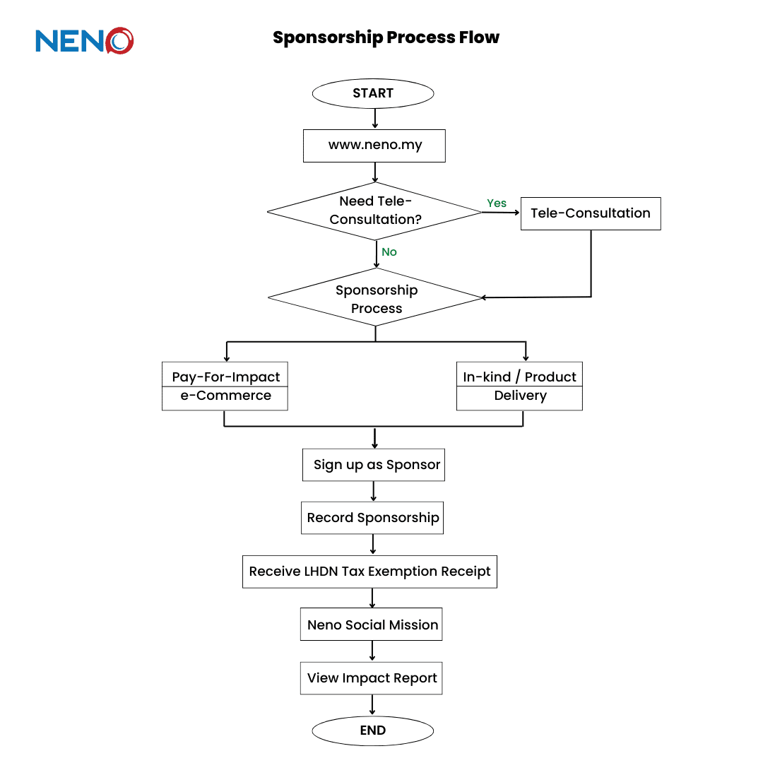 Figure 1 demonstrates the Sponsorship Process Flow as a guidance for Sponsors or Contributors. Sponsors or Contributors can make payment through eCommerce by opting for Pay-for-Impact tab or book a Free Consultation Session, accessible via NENO website. Sponsors or Contributors (Individual / Organisation) can choose to sponsor NENO Social Mission (Outreach, Academy, Gig) for an individual / a group / a community. NENO also receive sponsorship in-kind in the form of medical / rehab products to be distributed to the targeted beneficiaries.  After the sponsorship transaction, Sponsors or Contributors will receive LHDN Tax Exemption and be able to view the NENO Impact Report on the website once the Social Mission program is completed.
