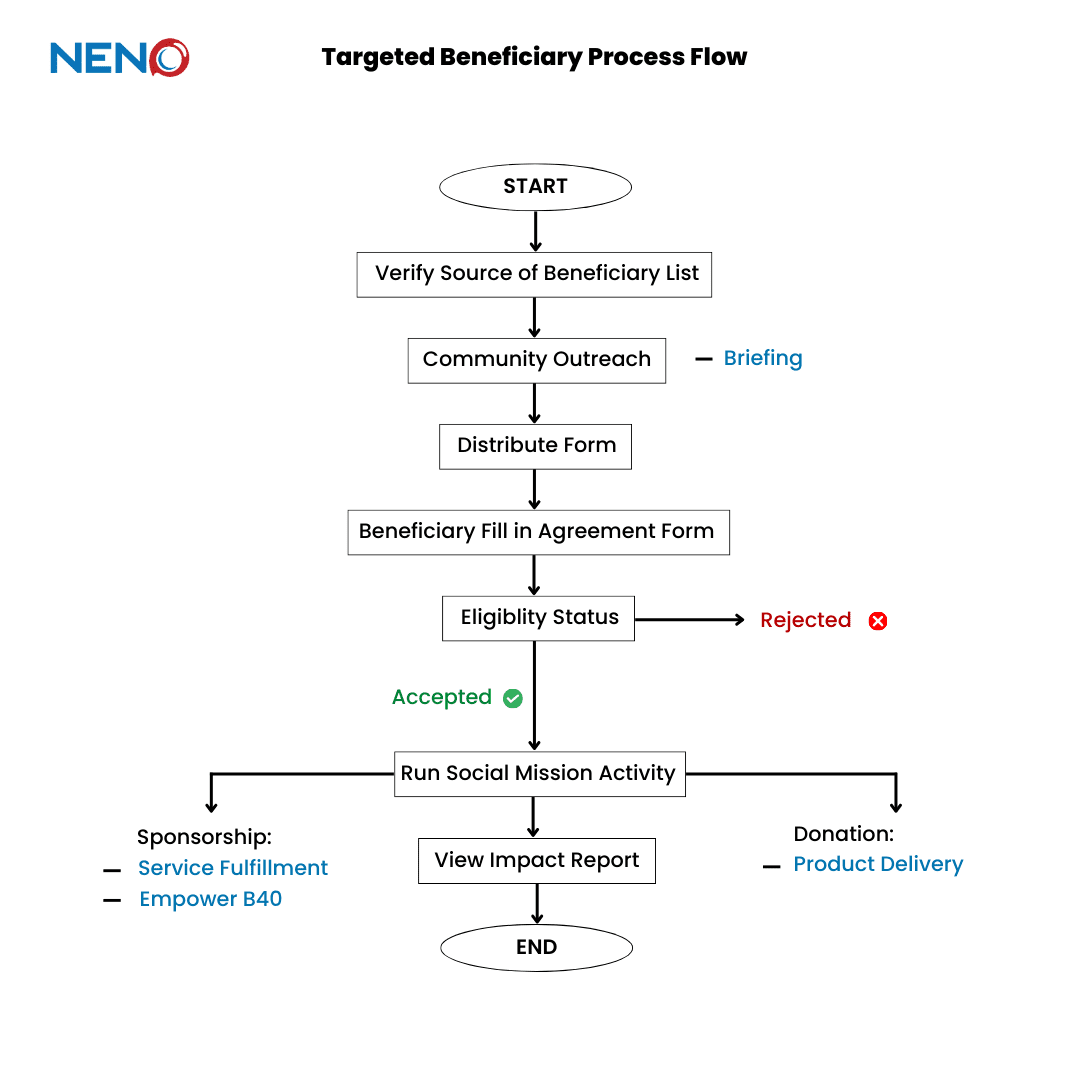 Figure 4 demonstrates the Targeted Beneficiary Process Flow as a guidance for Targeted Beneficiaries. NENO will refer the source of the beneficiary list to Jabatan Kebajikan Masyarakat (JKM), Community Leaders, etc. for status verification. Next, Community Outreach is conducted to brief on subsidized healthcare services and training offered by NENO for underserved community. An agreement form will be distributed by NENO to be filled out by beneficiaries. Lastly, NENO will run Social Mission Activities only for eligible beneficiaries and publish the activities in our Impact Report.